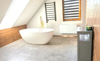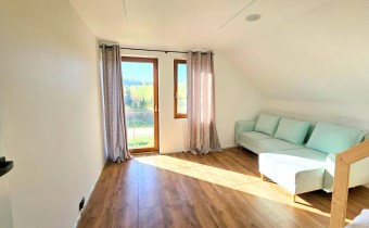 Piętro: duże, jasne sypialnie z pięknym widokiem na las oraz łazienka
