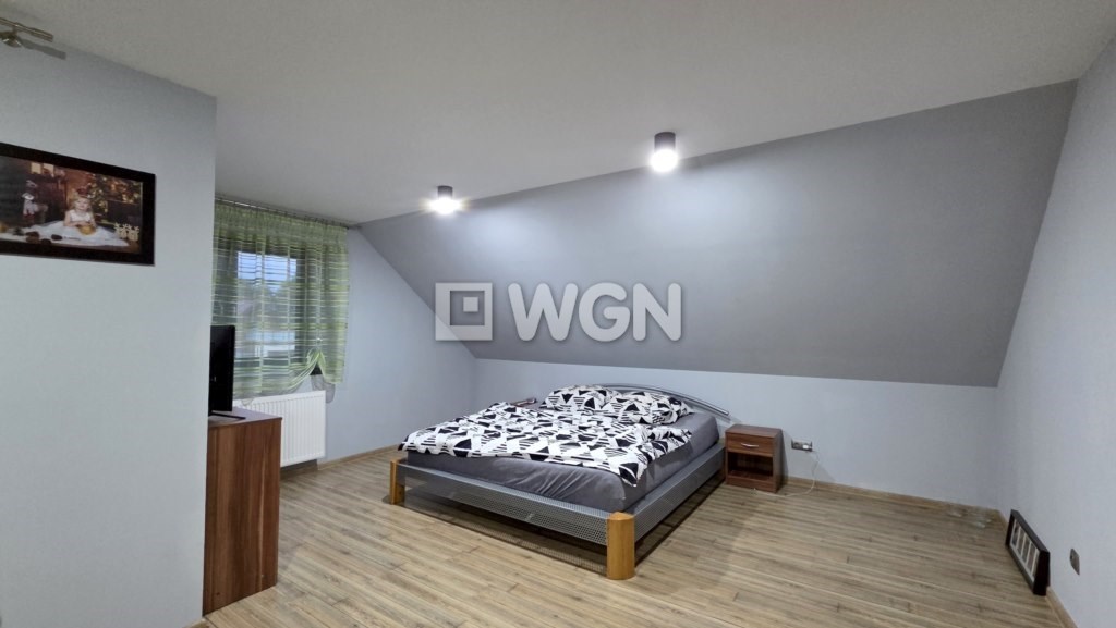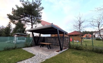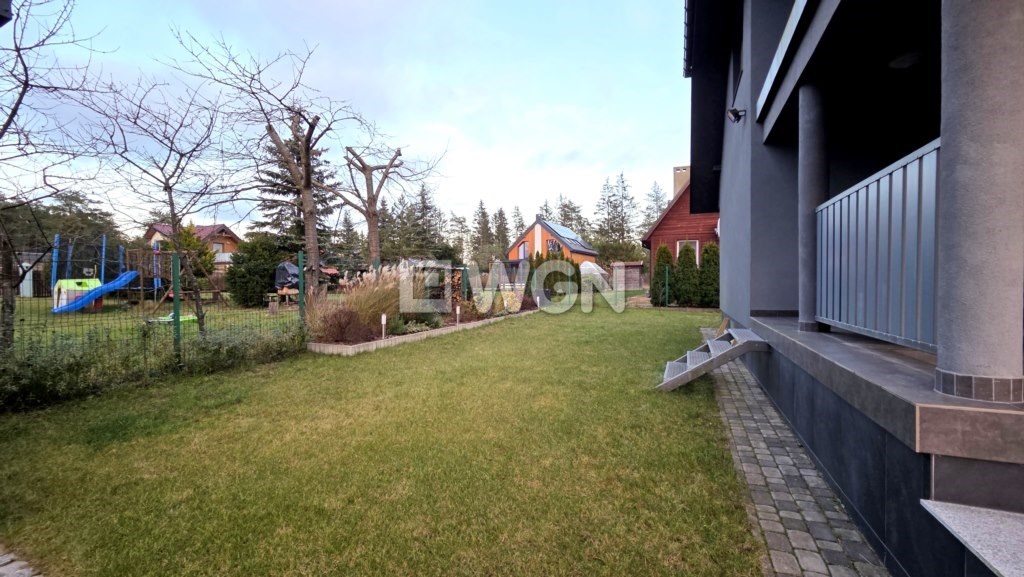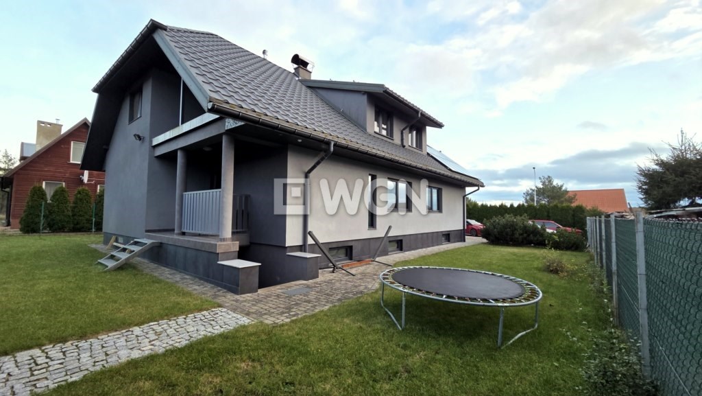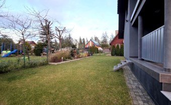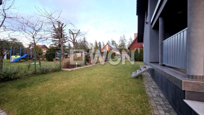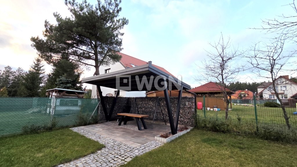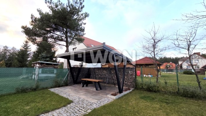 Nieruchomość wyróżnia się pięknie zagospodarowanym ogrodem z krzewami ozdobnymi. Na posesji znajduje się również wiata grillowa, usytuowana na utwardzonym podłożu z kostki i estetycznie wkomponowana w część kamiennego ogrodzenia. Kostka brukowa została ułożona także wokół domu, a całość dopełnia zadbany podjazd oraz wygodne ciągi piesze. Posesja jest w pełni ogrodzona, z reprezentacyjnym frontowym ogrodzeniem z kamienia, co zapewnia prywatność i poczucie bezpieczeństwa.