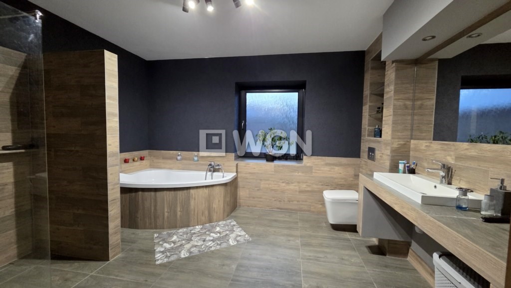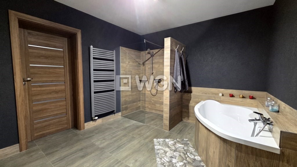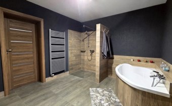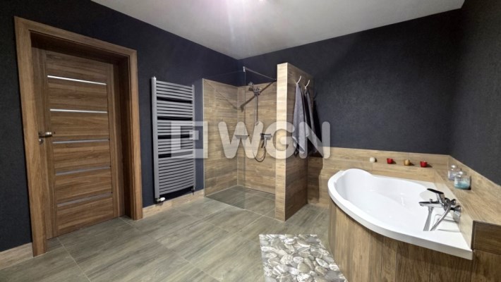 duża łazienka z wanną narożną oraz prysznicem z odpływem liniowym,