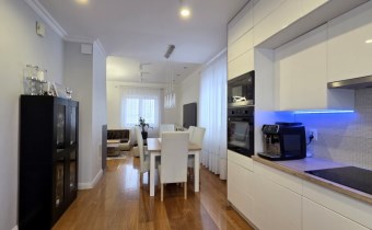 kuchnia w zabudowie z pełnym AGD: piekarnik, płyta indukcyjna, zmywarka, lodówka, okap