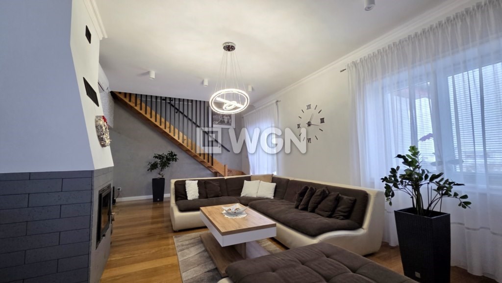 Sercem domu jest przestronny salon z jadalnią i aneksem kuchennym, w którym centralne miejsce zajmuje nastrojowy kominek. Z salonu prowadzi bezpośrednie wyjście na słoneczny taras (ekspozycja południowo-zachodnia) z widokiem na zadbany ogród. Na poddasze prowadzą dębowe schody.