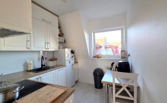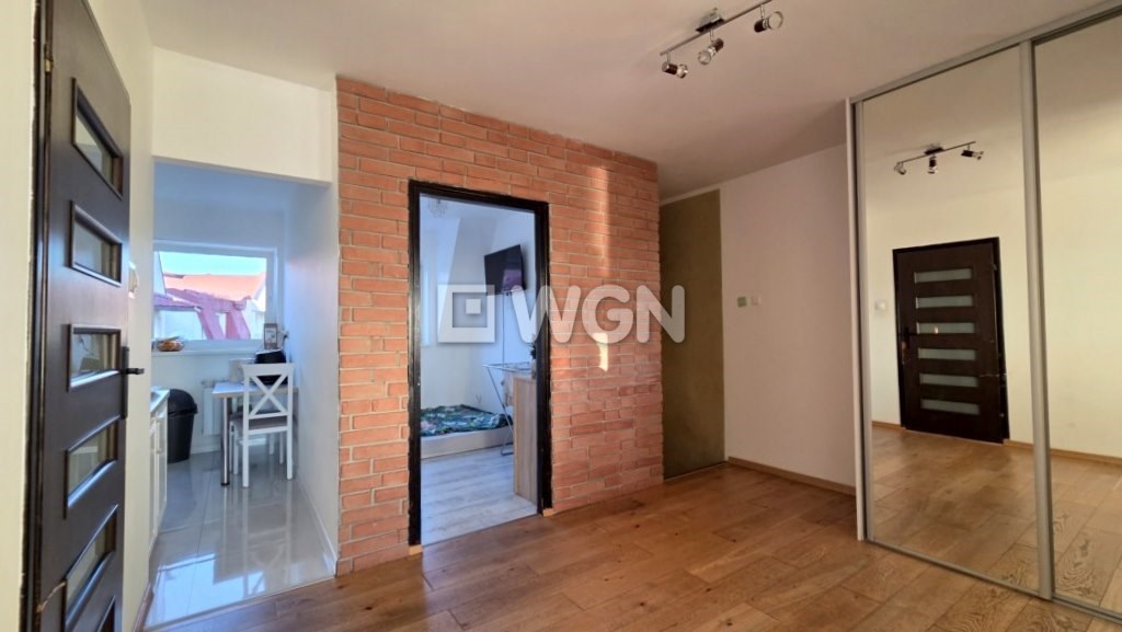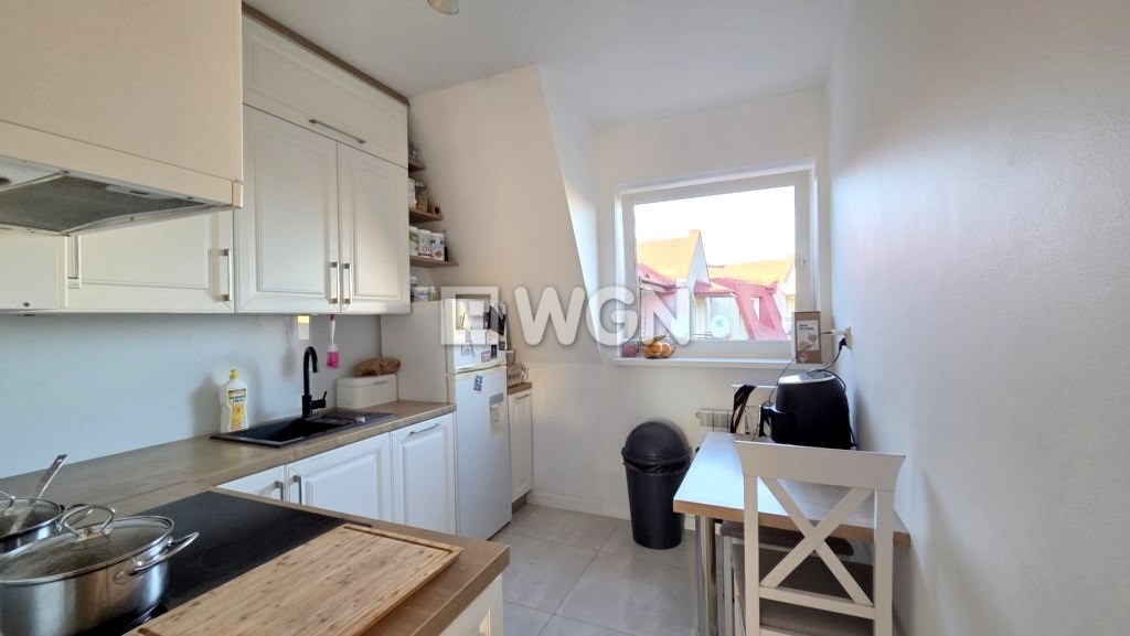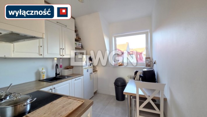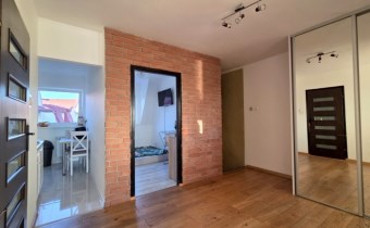 Drugi poziom mieszkania stanowi przedpokój z dużą szafą w zabudowie z drzwiami przesuwnymi, oferującą dodatkową przestrzeń do przechowywania. Oddzielna kuchnia, urządzona w stylu skandynawskim, wyróżnia się jasną kolorystyką, minimalizmem i ciepłem naturalnego drewna. Kuchnia została w pełni wyposażona w sprzęt AGD, w tym zmywarkę, piekarnik oraz płytę indukcyjną.