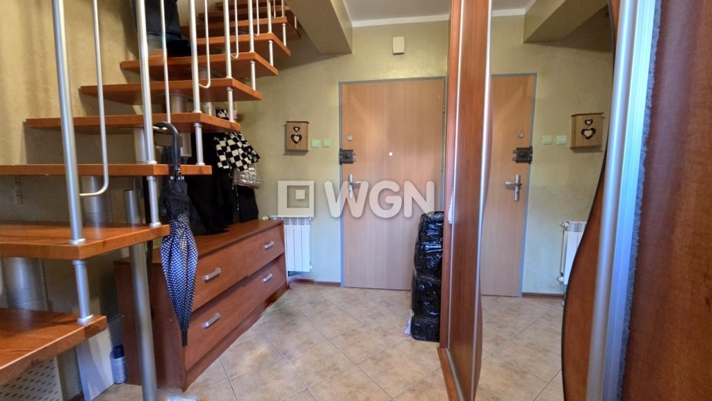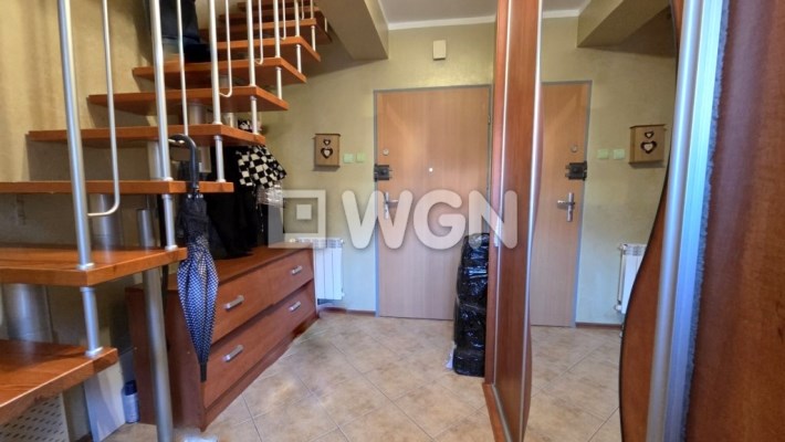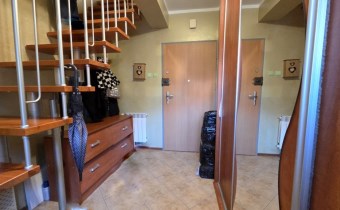 Pierwszy poziom mieszkania stanowi przestronny przedpokój, który zapewnia wygodne miejsce do przechowywania odzieży wierzchniej oraz obuwia. Znajdują się tu praktyczna szafa i komoda, które ułatwiają utrzymanie porządku w codziennym życiu. Z przedpokoju prowadzą schody na drugi poziom mieszkania, gdzie znajduje się część dzienna.
